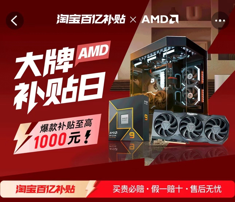 答案当然有,AMD(超威)已经考虑到大家迫不及待的装机需求,特别联合淘宝百亿补贴推出了大牌补贴日活动。在AMD大牌补贴日上线时间内,多款AMD产品打造的爆款电脑整机可享至高1000元的官方补贴,下面就来为大家详细介绍一下这次AMD大牌补贴日活动吧!