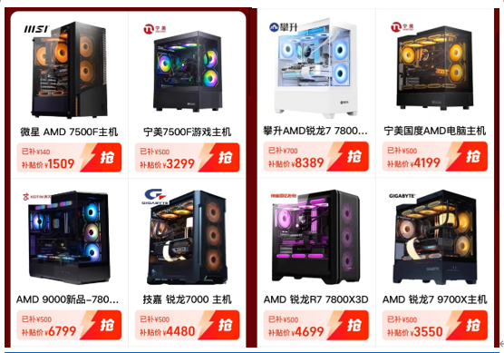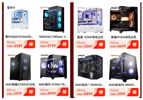 可以看到,本次AMD大牌补贴日为大家精选了非常多的爆款整机,这些主机在拥有超高性能的同时都加持着各装机商品牌设计的独特理念,所以每一款的整体定位和外观都不尽相同。不过它们使用的均为AMD锐龙7000/9000系列处理器作为核心,搭配AMD Radeon显卡共同打造,这就是最大的性能保障。