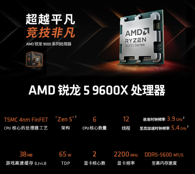 第一套配置是一套定位主流电竞游戏玩家,所以价格方面十分有性价比,整机配置仅5499元,虽然价格不贵,但配置可是一点不差,CPU选择了才刚刚发布的Ryzen5 9600X,其基于全新Zen5架构打造,拥有6核心12线程,最大频率5.4GHz,32MB三级缓存,TDP为65W,首发售价为1949元,相比于上代7600X的首发价略低,相对来说更有性价比。这次Zen5架构的提升可以说主要集中在能效比方面,全新的9600X对比上代锐龙57600X频率提升了0.1GHz,TDP保持不变,因此散热方面选择了雅浚ProArtistE3 V2,压制这颗U可以说简简单单。