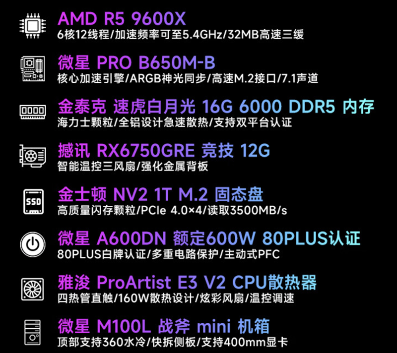 主板方面则选择的是微星PRO B650M-B,足够完全释放这颗U的性能;机箱与电源也都采用的是微星品牌产品分别是微星PAGFORGE M100L 战斧mini机箱以及微星MAGA600DN 白牌电源,能够满足这套配置的供电需求。显卡方面则是选择了今年上半年好评如潮,超高性价比的撼讯RX6750GRE竞技12G,在价格差不多甚至更低的情况下跑分超出RTX4060一大截,堪称游戏玩家的一大福音。固态挑选了久经考验的金士顿NV2 1TB固态,内存则是金泰克速虎白月光16G 6000 DDR5内存条,后续用户可以自由升级32GB。