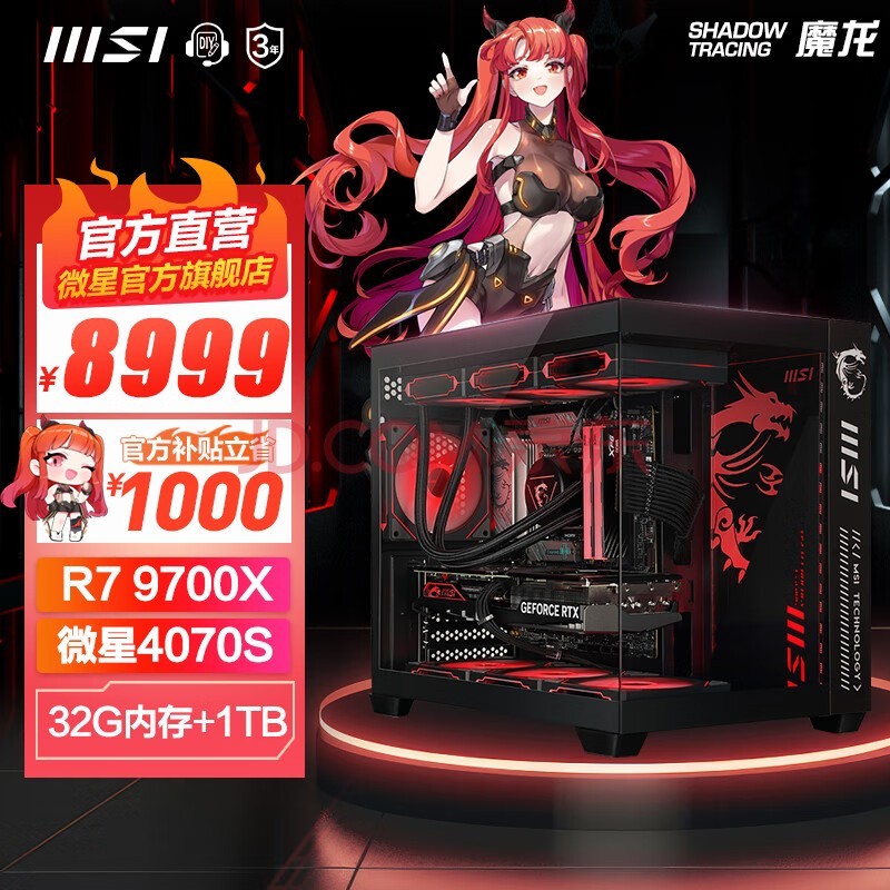 微星AMD新品全家桶锐龙7 9700X组装电脑微星4070SUPER电竞游戏台式主机直播设计剪辑AI绘画整机DIY组装 9700X+微星4070S+32G丨配置五