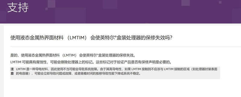 其实英特尔以及AMD质保政策本身就是如此,只要无法看清编号和型号就不能提供保修。英特尔也官方明文表示使用液态金属热界面材料(LMTIM),会使Intel盒装处理器的保修失效。因为LMTIM可能具有腐蚀性,可能会擦除处理器上的标记,而这些标记对于验证产品是否有保修声明是必要的。所以此次拒保确实事出有因。
