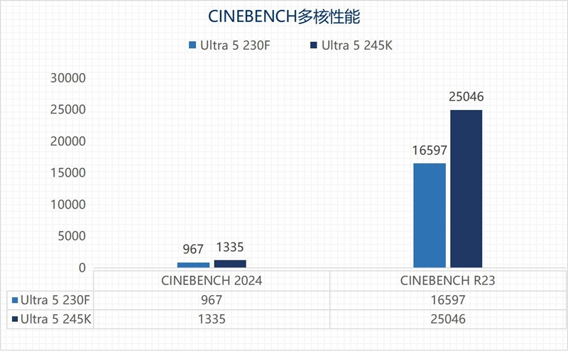 单核性能方面,酷睿Ultra 5 230F在R23测试标准下得分为1965分,2024测试标准下为115,不错的睿频加速能力使其单核性能可以与Ultra 5 245K掰掰手腕,这意味着它的游戏性能其实是可以与Ultra 5 245K有一拼的。