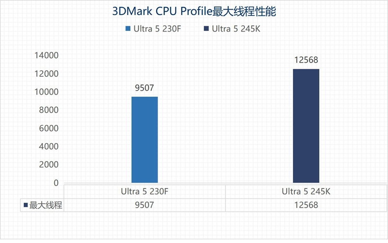首先在单线程和最大线程性能上,酷睿Ultra 5 230F得分分别为1229和9507,单线程甚至还比Ultra 5 245K要高点,这其实说明0.2GHz的睿频性能差异在3DMark测试中并不那么敏感。从中可以看出物理渲染过程中,0.2GHz睿频差异影响不大,所有酷睿Ultra 5 230F的游戏性能应该与Ultra 5 245K差不了太多。如果购机预算比较紧张,可以选择便宜200元的Ultra 5 230F。