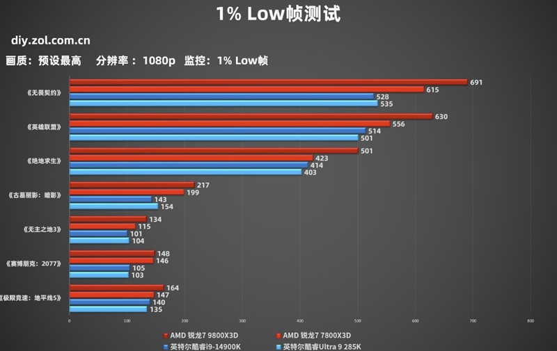 而9800X3D通过第二代3D V-Cache技术大幅提升了游戏1% Low帧的表现,游戏表现远超一般的处理器,隔壁更是。在很多游戏的平均帧数上比竞争对手最强的游戏处理器高出约20%。诚然不是所有游戏都能达到这样的帧数差异,但说明了9800X3D在游戏方面隔壁确实望尘莫及了。