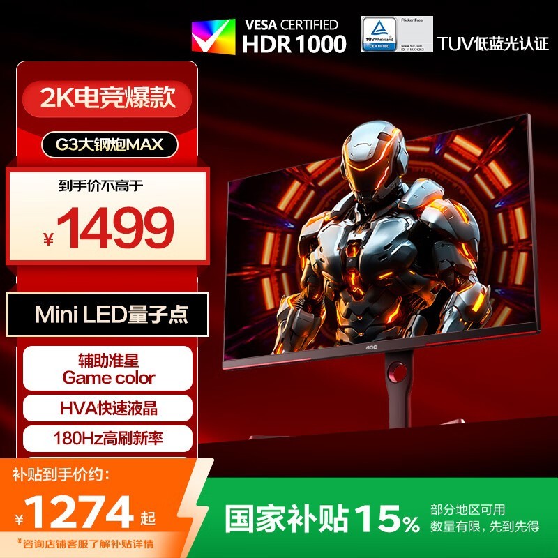 AOC Q27G3XMN 27英寸 2K QD量子点-MiniLED 1344颗LED 180Hz HDR1000 快速液晶1ms 电竞电脑显示器