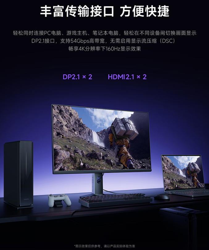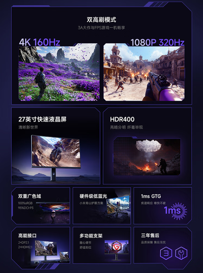 据介绍,小米 REDMI G27U显示器尺寸为27英寸,分辨率3840×2160,支持1ms GTG 响应、「4K160Hz」原生屏幕显示、「320Hz 竞技模式」显示。