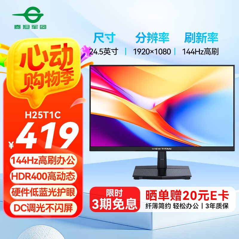 泰坦军团 H25T1C显示器原价449.00元,现在京东正在促销,参加每满460-50元的活动,还能使用国家补贴8.5折起,最终到手价只需356.15元/件,性价比很高,有需要的朋友可以入手。