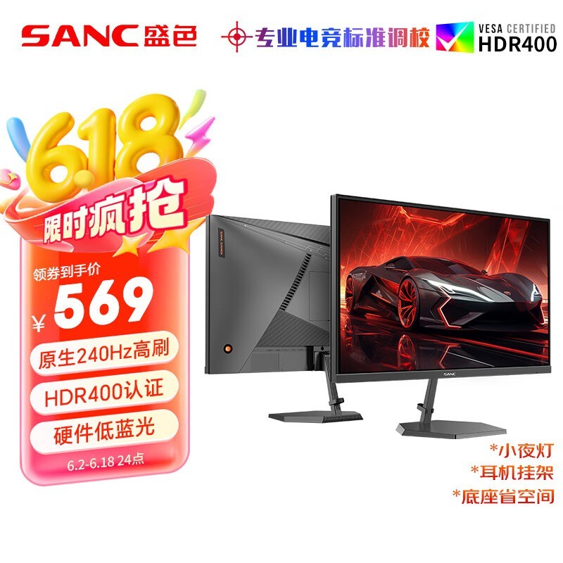 SANC N50Pro6 盛色24.5英寸原生240Hz硬件低蓝光 Fast IPS 电竞显示器 耳机挂架小夜灯 电脑屏幕