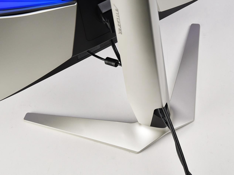 显示器底部印刻有蚂蚁电竞的品牌logo,同时在支架上印有蚂蚁电竞的徽标,加深用户品牌观念的同时,也一定程度上提升了产品辨识度。底座方面采用了比较经典的V形底座,在桌面上更加稳固,不小心碰到也不会倾倒,更适合人员密集的网咖场所。