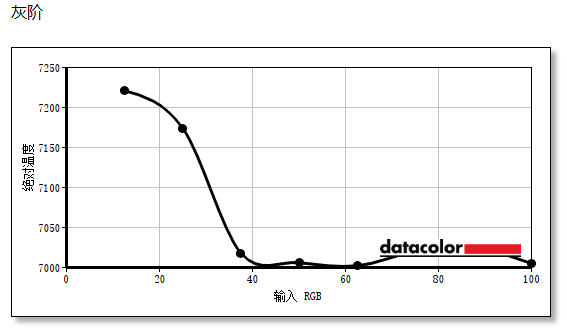 灰阶方面,显示器在40%-100%的亮度下表现比较稳定,整体色温维持在7000K以上,相比标准色温来说略微偏冷。