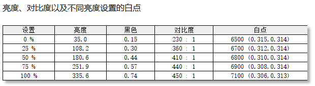 色温一致性方面,这款显示器的白点色温在6500K-7100K之间,色温随着亮度的增加变大,高亮度下白点色温偏冷。