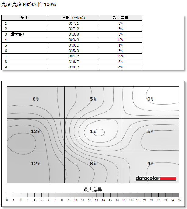 亮度均匀性的测试中,HKC G25H1显示器整体表现也还不错,亮度最大为第3象限,最大差异在第4象限,差值为40.6cd/m?。