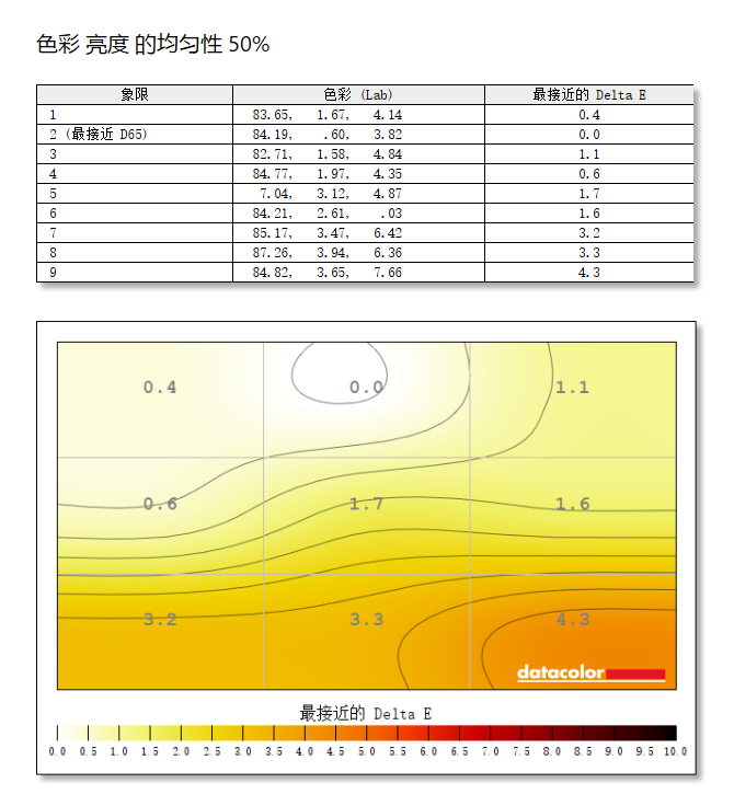 作为一款IPS显示面板,Lecoo N2739SQ电竞显示器的色彩亮度均匀性表现非常错,实测与标准的D65差距最大△E只有4.3。在日常使用中完全不用担心会有光斑、暗斑、亮斑或色斑等现象。