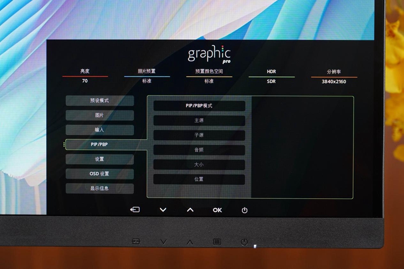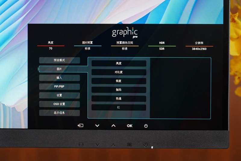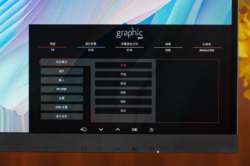 最新的graphic pro菜单专为重视高画质的用户设计,上方会常驻显示显示器当前的亮度、照片预置、预置颜色空间、HDR以及分辨率,用户可以通过菜单自如设置预设模式、显示器亮度、对比度、伽马值等参数,以获得最适合自己的画面显示。