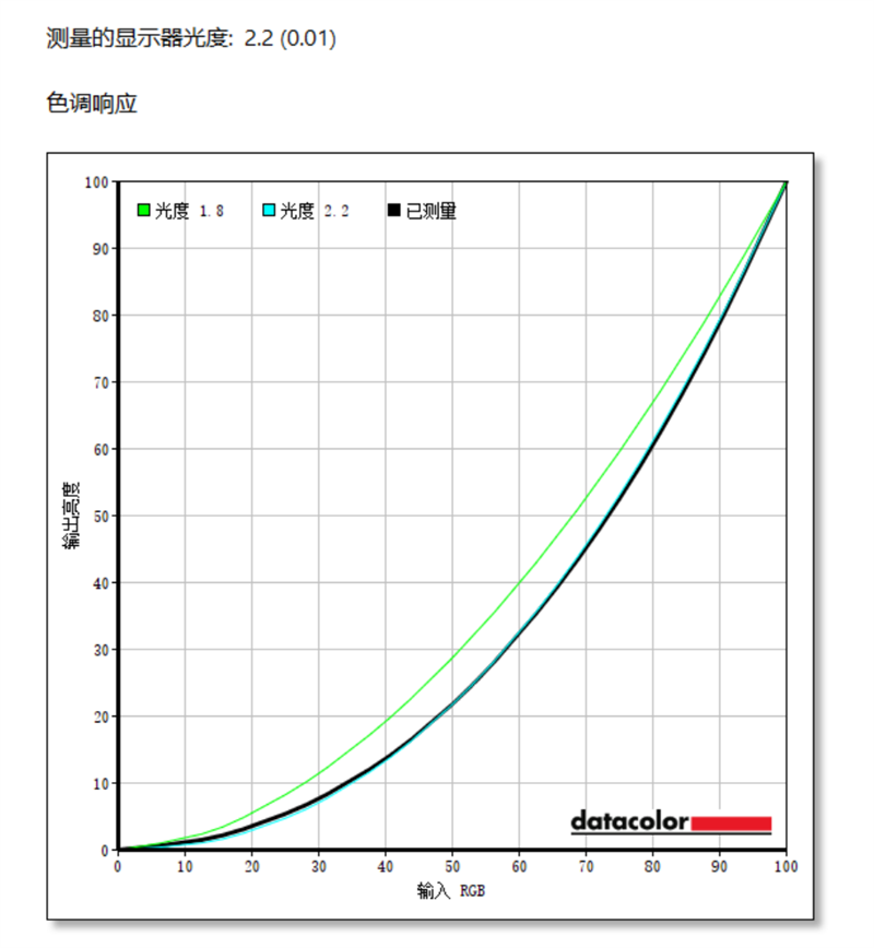色调响应方面,已测量的黑色曲线应该尽量和浅蓝色的“光度2.2”曲线保持一致,可以看到实测的黑色曲线和“光度2.2”差距较小,色调响应表现不错。