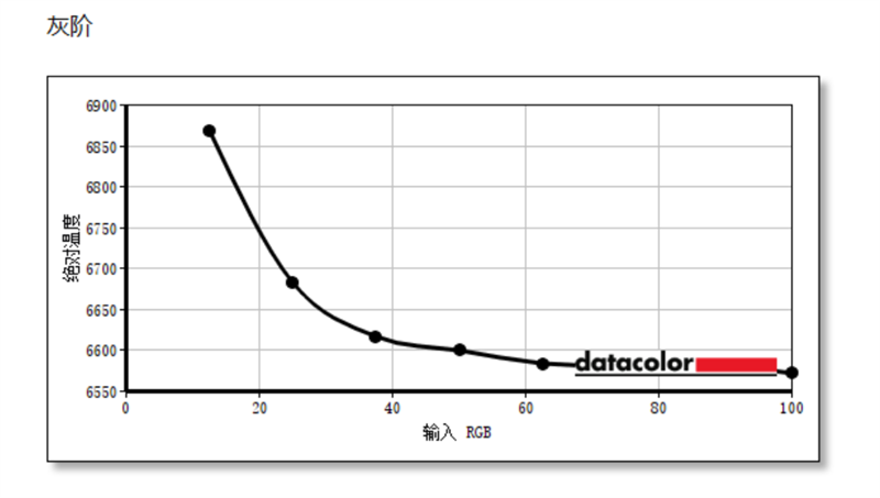 灰阶方面,显示器在30%-80%的亮度下表现比较稳定,整体色温维持在6600K上下,表现基本符合标准色温。
