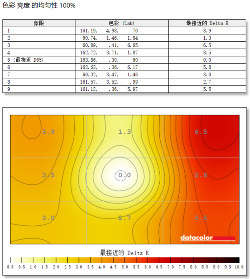 在色彩均匀性的测试中,AOC U32U3D显示器的第5象限最接近D65的标准,显示器右边第3象限与标准色温差值最大,不过也只有6.5,整体色彩均匀度表现尚可。