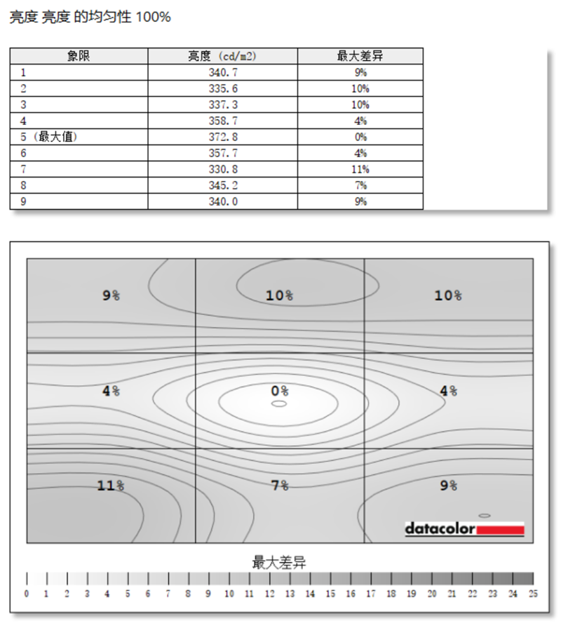 亮度均匀性的测试中,AOC U32U3D显示器整体表现也很优秀,亮度最大为第5象限,最大差异在第7象限,差值为42cd/m?。