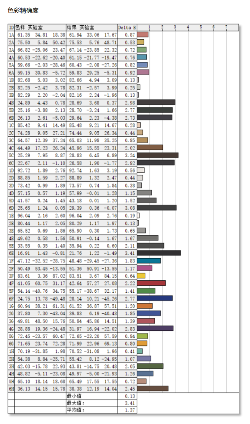 在色彩准确度的测试中,AOC U32U3D显示器结果为平均ΔE值为1.37,最大ΔE为3.41。一般来说平均ΔE<2,人眼就基本上分辨不出色彩的差异,AOC U32U3D作为一台专业显示器它的表现可以说非常不错了。