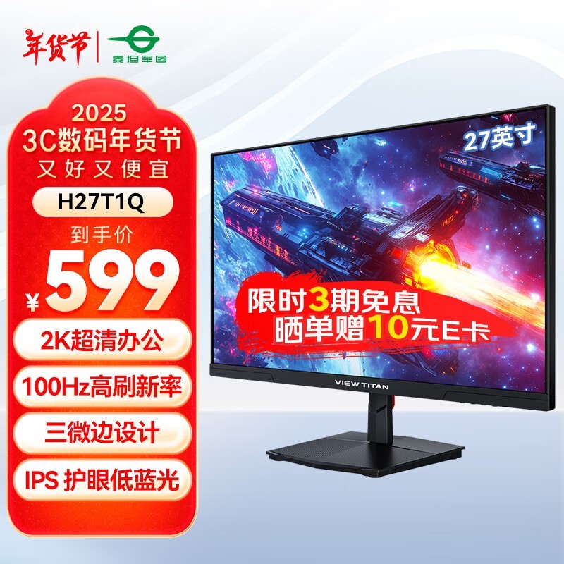 泰坦军团 H27T1Q 是一款27英寸的电脑办公显示器。它拥有2K分辨率和100Hz的高刷新率,能够提供清晰流畅的图像显示效果。此外,泰坦军团 H27T1Q还采用了三微边设计,外观时尚简约。泰坦军团 H27T1Q屏幕还支持低蓝光技术,可以有效减少对眼睛的刺激,保护用户的视力健康。目前泰坦军团 H27T1Q显示器在京东售价为649元,参与每满649元减50元优惠活动后,实际购买价格仅为589元。如果您正在寻找一款性价比高的显示器,那么泰坦军团 H27T1Q是一个不错的选择。