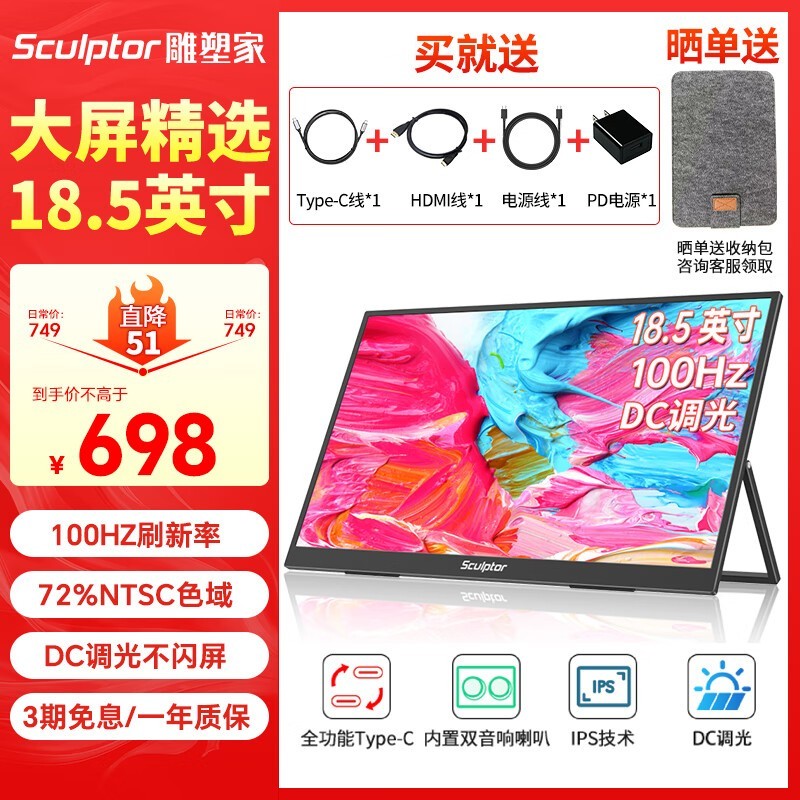 雕塑家 MF185LN 18.5英寸便携显示器,拥有更大的视野和全高清分辨率,呈现精致细腻的画面效果,搭配优异的散热性能与长久耐用品质,经过46道工艺及120号精细喷砂处理,带来温润舒适的触感体验。雕塑家 MF185LN采用无极支架设计,支持0-180°角度自由调节,满足不同使用场景需求,同时Type-C全功能接口实现一线连接,充电和视频信号输入更加便捷。雕塑家 MF185LN显示器具备多种连接方式、高色彩显示、便携轻薄以及丰富的配件优势,非常适合普通消费者使用,价格实惠且实用性强,原价698元,现使用满99减5元优惠券后仅需693元即可到手。不过需要注意的是,该产品对专业用户可能不够适用,并且可能需要额外购买线材和适配器,建议在购买前确认设备接口类型以避免不必要的花费。