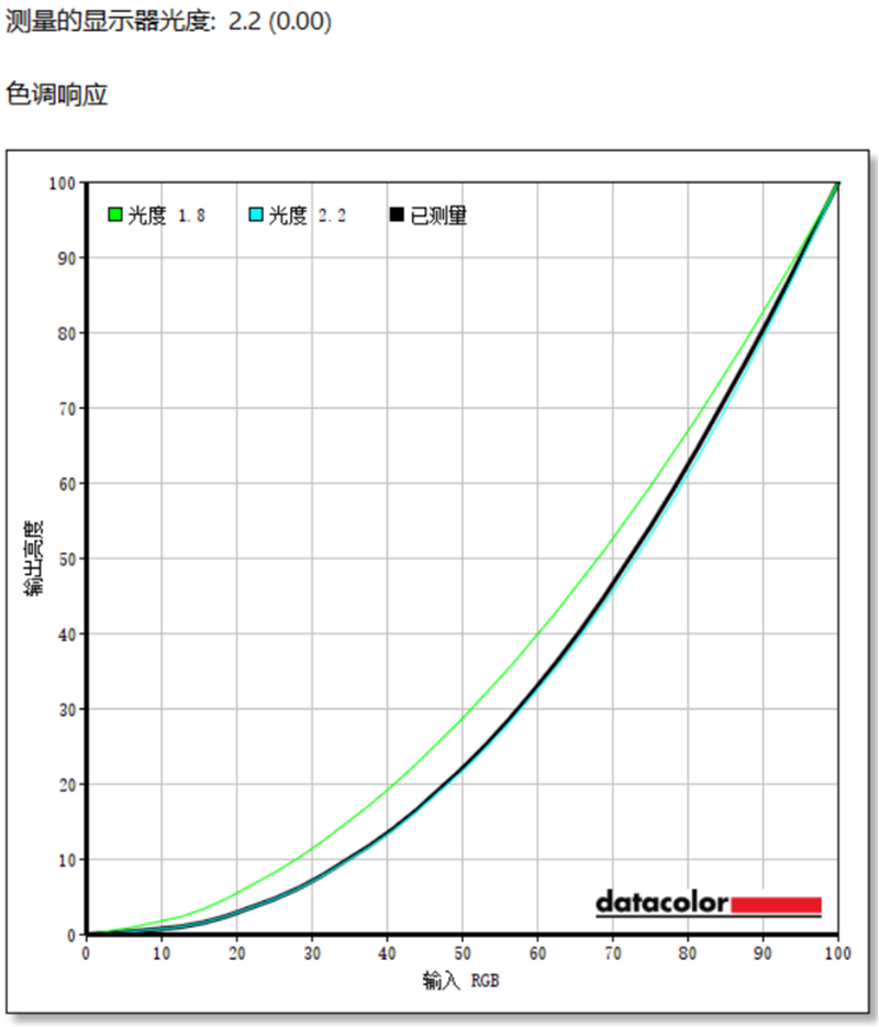 色调响应方面,已测量的黑色曲线应该尽量和浅蓝色的“光度2.2”曲线保持一致,可以看到实测的黑色曲线和“光度2.2”差距较小,色调响应表现十分不错。