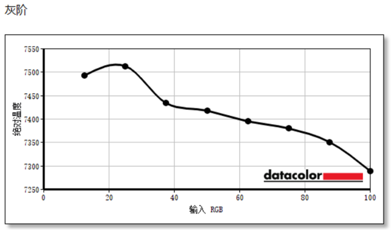 灰阶方面,显示器在全亮度下表现稳定,整体色温维持在7250K-7550K之间,比较贴近标准色温。