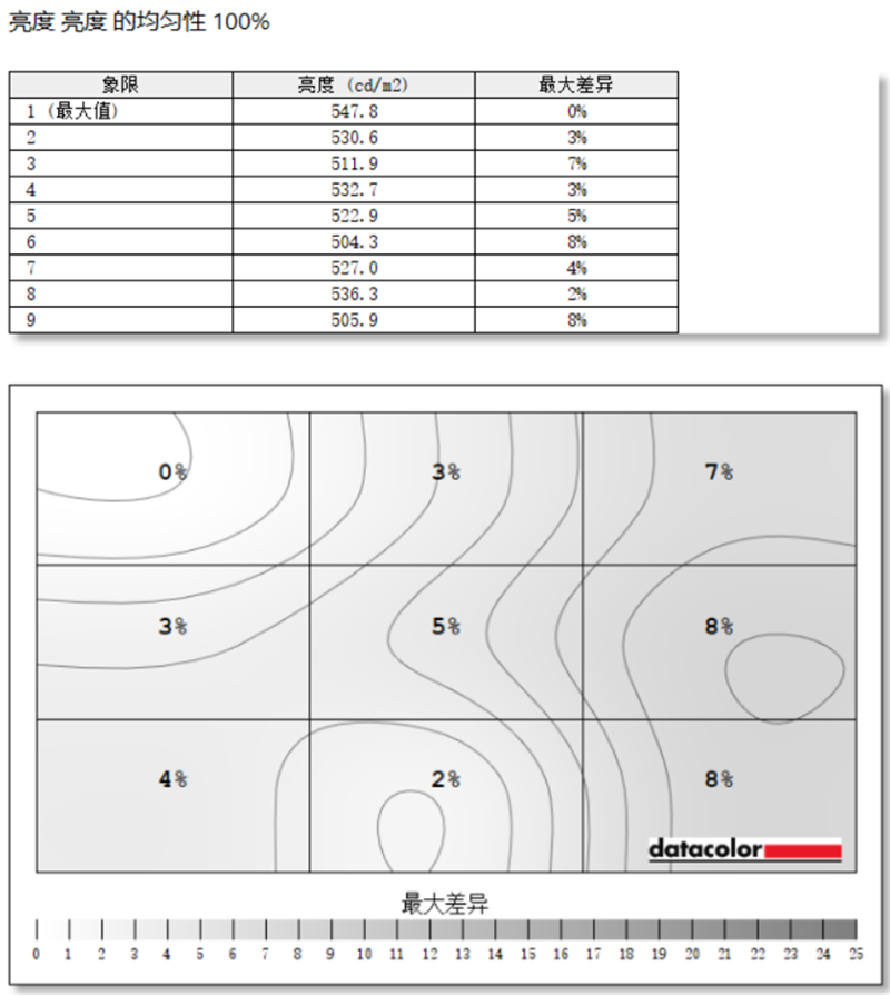 亮度均匀性的测试中,蚂蚁电竞ANT253PQ显示器整体表现也很优秀,亮度最大为第1象限,最大差异在第6象限,差值为43.5cd/m²。