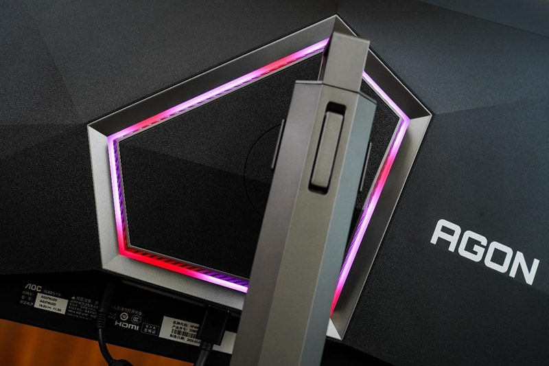颜值方面,AGON AG276UZD延续家族系列的电竞桌面美学。背面提供Light FX灯光系统,开启之后电竞氛围直接拉满。背面中央并不规则,与众不同,特别是点亮灯光之后,更显独特。与背面相得益彰的,是支架底座,同样是不规则形状,依旧非常稳固。而且该设计占用桌面面积更小,更有利于桌搭。
