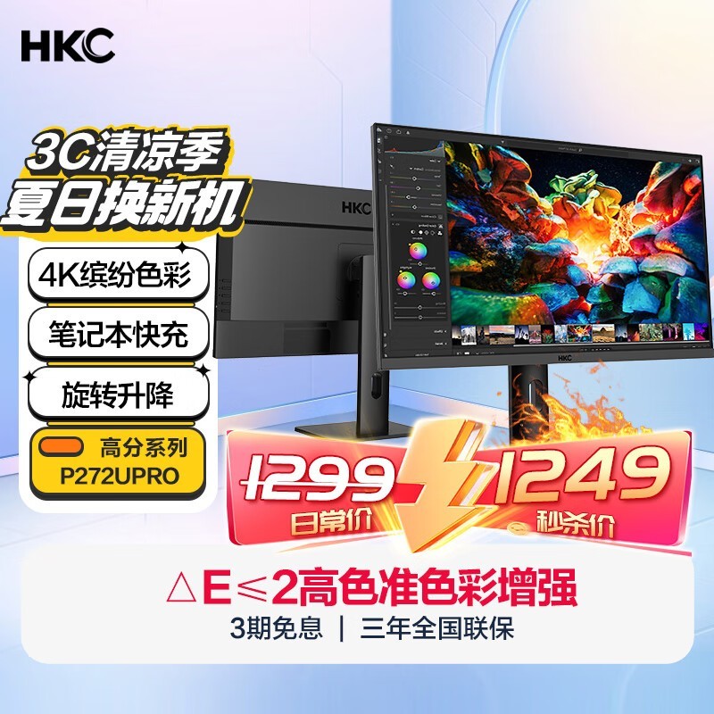 HKC P272U Pro 显示器现在有优惠活动,原价1299元,但现在只需1249元就能购得。这款显示器拥有27英寸的4K超清IPS面板,像素高达163,画质细节更丰富。支持95%DCI-P3以及100%sRGB广色域覆盖,可显示10.7亿色,色彩更加丰富。HKC P272U Pro还经过专业级的色彩校准,平均DeltaE小于2,还原色彩更加真实细腻。