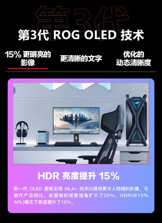 这是一款采用了32英寸双模OLED的电竞显示器,依靠第三代ROG OLED技术,可支持4K 240Hz与1080p 480Hz双模式切换。同时加入了全新的AI助手,可为玩家提升游戏体验。