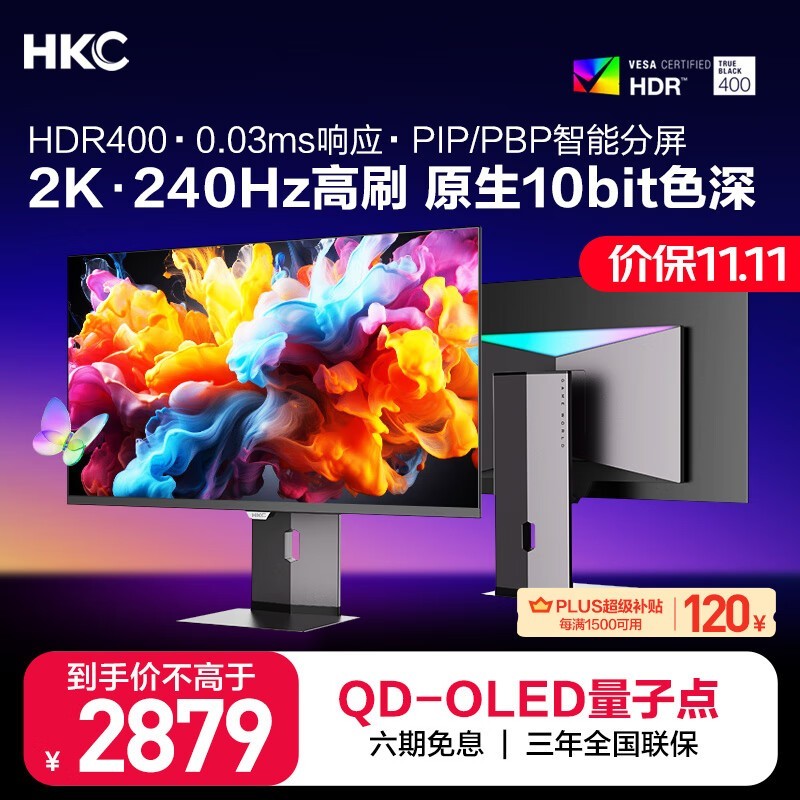 HKC GS27QK 26.5英寸OLED显示器,轻薄机身,出色画质。这款显示器采用 OLED 技术,拥有出色的色彩表现力和黑色深度。此外,HKC GS27QK还具有 2560×1440 的高分辨率和 240Hz 的刷新率,使图像更加清晰流畅。现在购买可以享受满2599元减280元、满1500元减120元、满200元减20元优惠券的活动,实付只需2559.01元,性价比极高!同时,参与每满3999元减1000元的优惠活动,购买此款显示器更能获得实惠。对于需要高性能显示器的人来说,这款显示器是非常不错的选择。