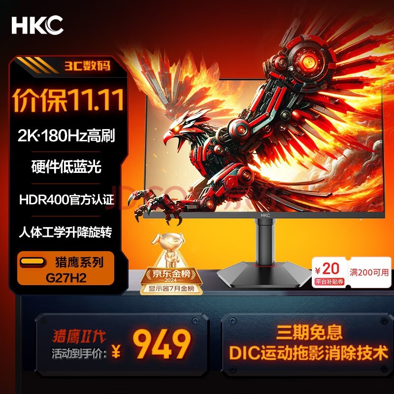 HKC G27H2也是一台27英寸电竞显示器,分辨率为2K,刷新率高达180Hz,同时也有Display HDR400认证,是一台素质全面的电竞小金刚。HKC G27H2原价1049元,叠加满减直降和平台补贴,到手价只有949元。