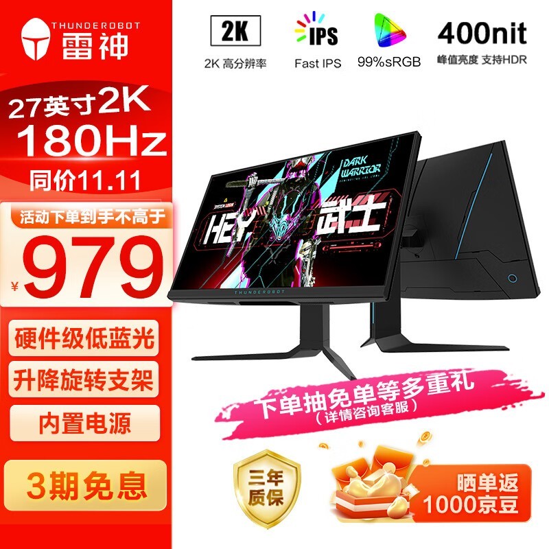 雷神 DQ27F180L 27英寸2K180Hz 硬件低蓝光 Fast IPS 1ms快速液晶升降旋转电竞游戏电脑显示器