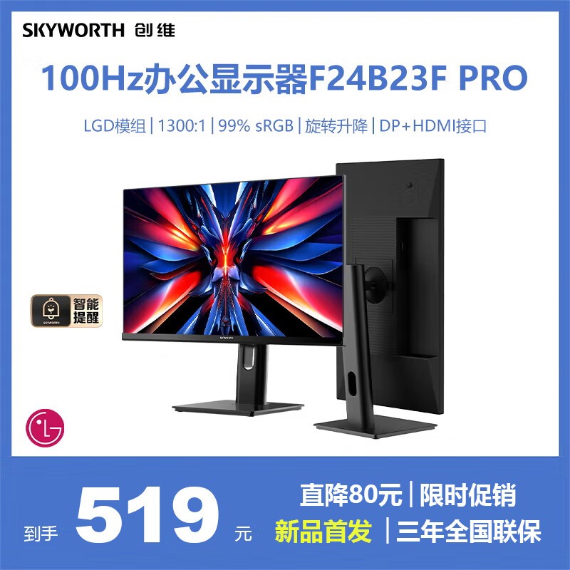 最重要的是,创维 F24B23F Pro显示器现在正在参加满589减80的促销活动,原价599元的商品现在只需519元即可入手!如果您喜欢这款产品,那么千万不要错过这次优惠机会!