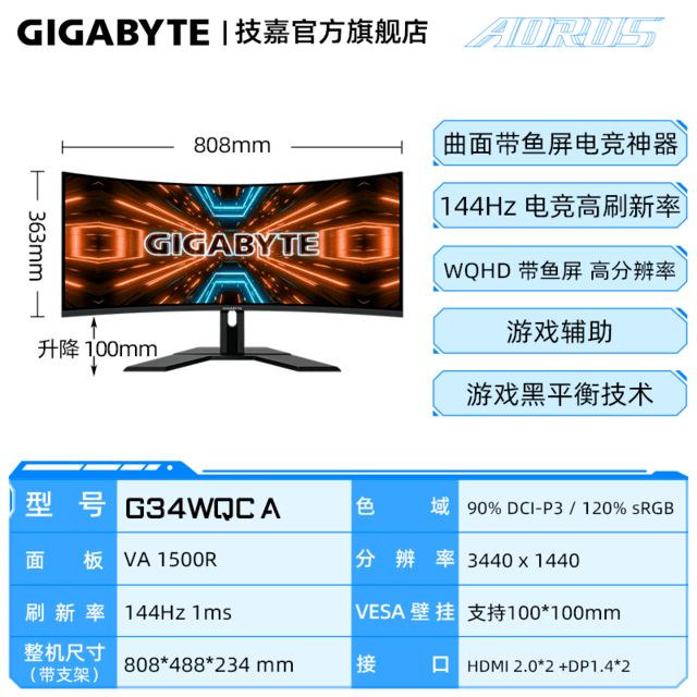 技嘉 G34WQC A 34英寸 准4K显示器 144Hz 21:9曲面带鱼屏 可壁挂 内置音箱 准4K 带鱼屏144Hz