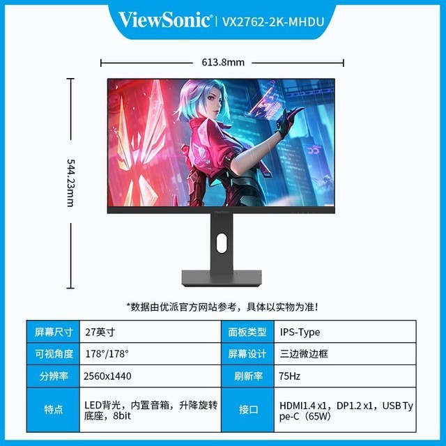 优派 VX2762 27英寸2K高清显示器 8bit 高色域 可壁挂 微边框广视角 家用办公 台式电脑显示屏幕【typc/内置音箱】