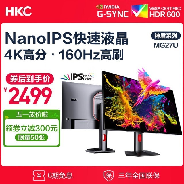 HKC MG27U 27英寸 Nano IPS屏 4K高清160Hz超频 10.7亿色HDR600 四边微边框旋转升降电竞屏显示器