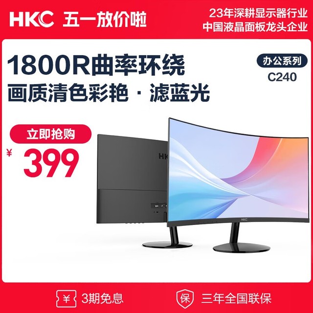 惠科 C240显示器大幅降价!现在在京东购买,满619元就能减230元,只需399元就能带回家!惠科 C240显示器具有1800R曲面柔性屏、超薄机身、超窄边框、滤蓝光不闪屏等特点,非常适合我们使用。惠科 C240采用第二代三星VA曲面板,拥有3万:1的静态对比度和178°从广角度看,画质清晰细腻,色彩更丰富。如果你对视觉体验有很高的要求,注重外观设计,惠科会 C240显示器绝对值得考虑。但需要注意的是,它不能调整高度和旋转角度,所以如果你需要更多的可调性,你需要考虑其他选项。总之,这款显示器价格实惠,性能优异,是一款非常推荐的产品。