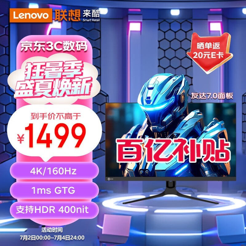 联想来酷 N2721U27英寸4K 160Hz Fast-IPS 1ms响应支持HDR 400nit低蓝光不闪屏电竞显示器