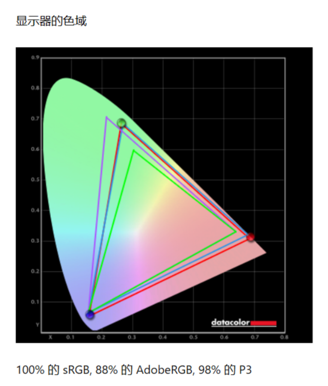 通过实测结果来看,科睿P6显示器在sRGB色域的覆盖率为100%,AdobeRGB色域的覆盖率为88%,P3色域的覆盖率为98%。相较于同价位的显示器来说,这样的表现还是让人非常惊喜的。