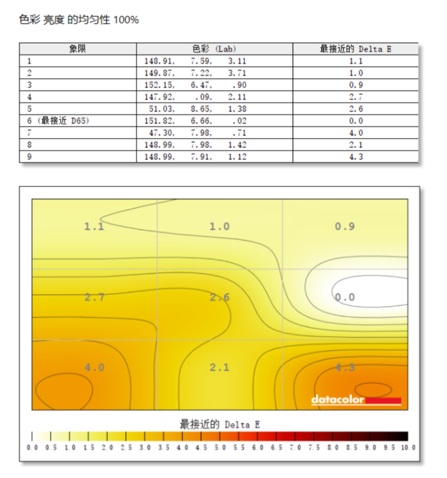 在色彩均匀性的测试中,可以看出科睿P6的第6象限最接近D65的标准,显示器面板的第9象限与标准色温值有一定差距,差距数值为4.3。显示器整体的色彩均匀性非常不错。