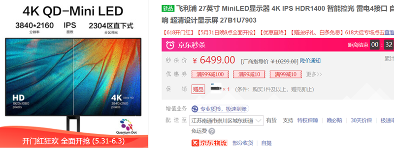 飞利浦 27B1U7903 27吋 MiniLED显示器 4K IPS HDR1400 智能家居控光 雷雨4接口 便携式扬声器 超清设计液晶屏