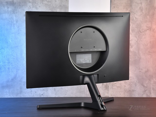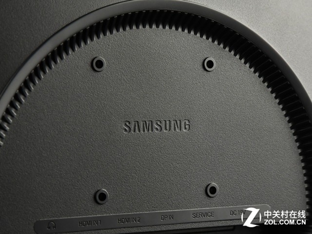 我们的目光转到显示器的背面,可以看出,三星 CRG5的背面也经过了精心设计,简洁而不凌乱。上方长条形开槽平衡了背面布局的重心,避免了太多元素聚集在一起而影响美感的问题。而中间巨大的圆形凹陷配合一圈精美的放射线纹路令人印象深刻。