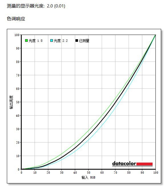 色调响应方面,已测量的黑色曲线应该尽量和浅蓝色的光度2.2曲线保持一致,可以看到实测的黑色曲线和光度2.2曲线间并没有很大的距离。表现也算可以。