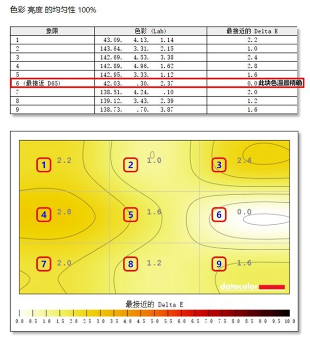 在色彩均匀性的测试中,可以看出显示器右侧的6号区域最接近D65的标准,显示器左侧4号区域的色温与标准色温值有一定差距,差距数值为2.8,显示器整体的色彩还是比较均匀的。