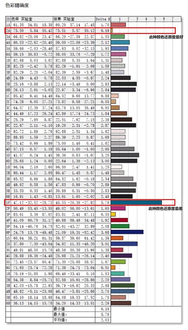 色彩精确度方面,显示器测试的48种颜色的平均△E值为2.03,最小值为0.19,最大值为5.76,当1<△E<3时,人眼需要仔细比对才能辨别两个颜色的差异,作为电竞显示器来说这个色准表现已经非常的优秀了,三星把这块VA面板调试的非常强悍。
