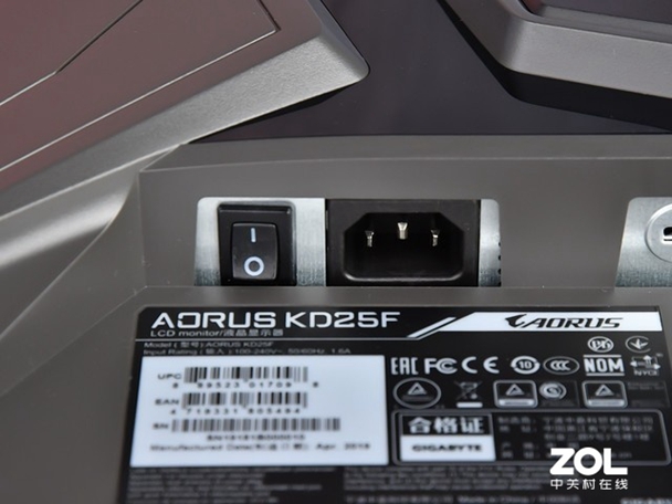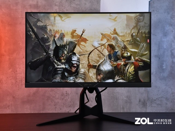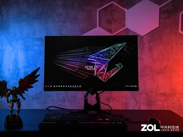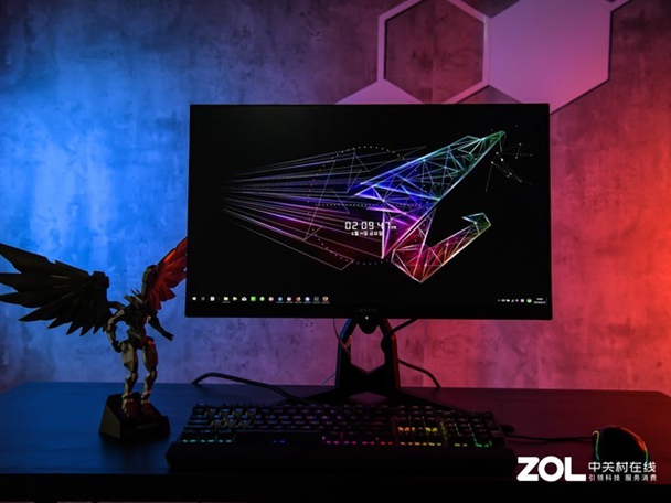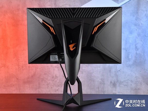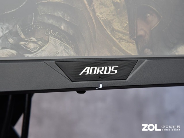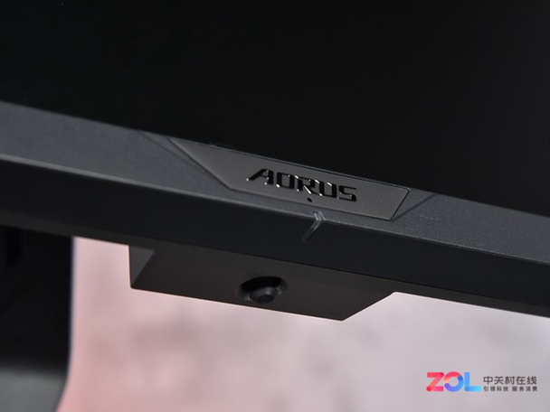机身正面的下方银色AORUSLOGO在黑色的背景下颇具质感,下方有一个显示器指示灯,整体边框磨砂的质感使显示器的正面变得更加沉稳。