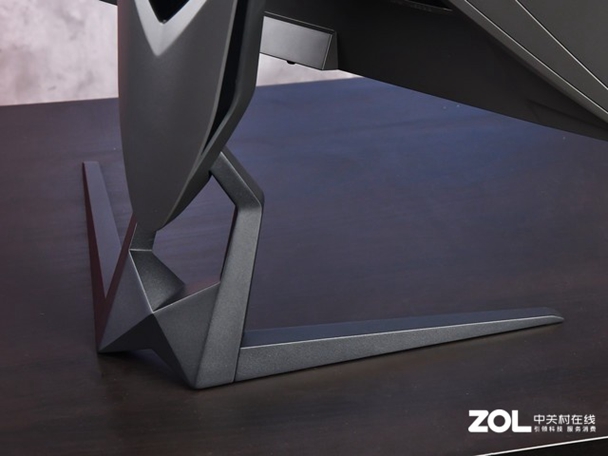 来到显示器的背面或许我们就明白了什么是力量与美感并存,可以看到线条非常的硬朗,充满电竞显示器特有的力量感。灯带部分采用亮面设计,搭配背面整体的磨砂质感并不突兀,反而有一种深邃的科技感,既性感又迷人。